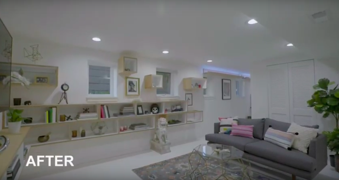 A dark basement transformed into a bright gallery-inspired living space for a young family & their cat Taffy.