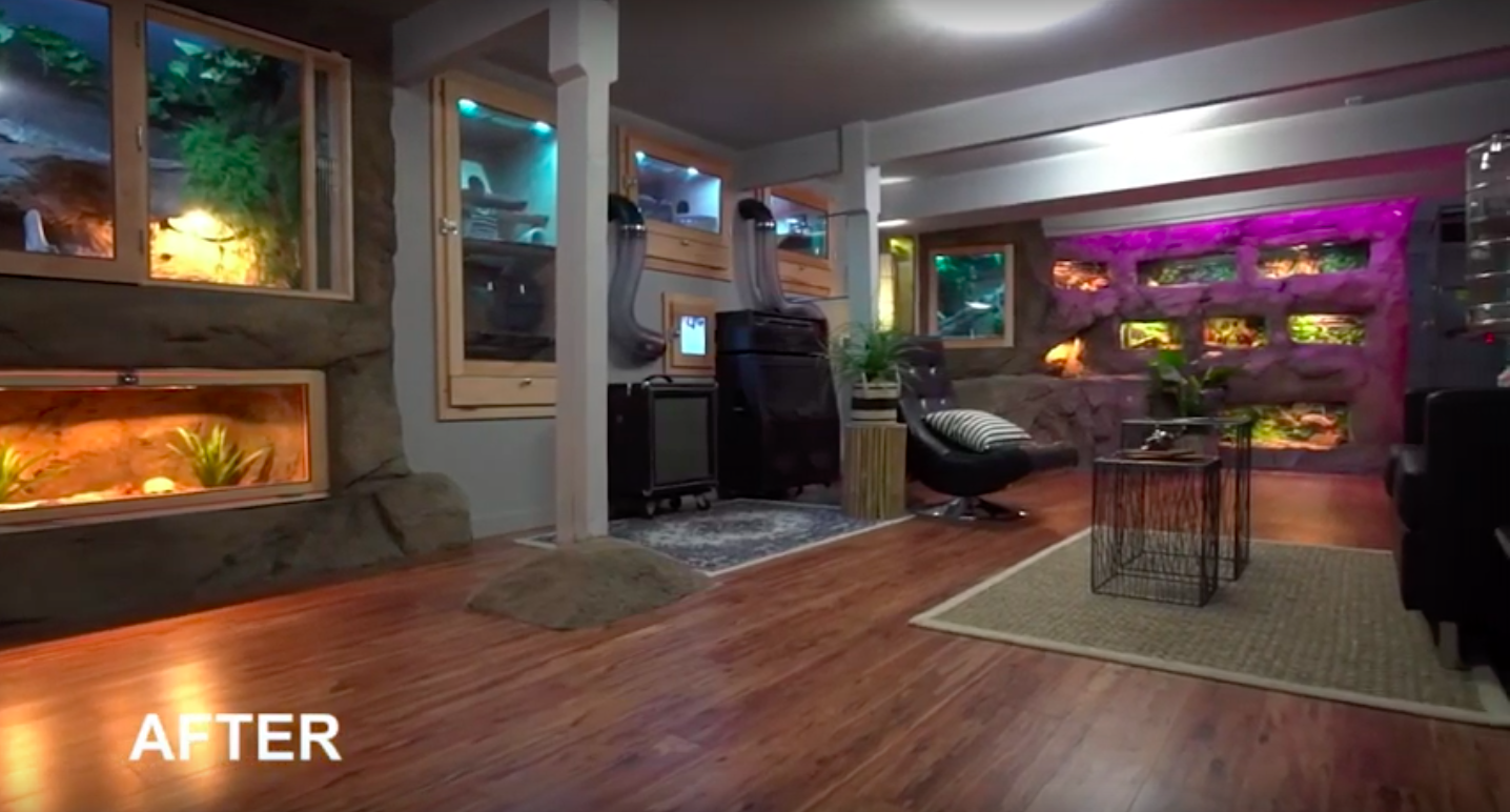 A cluttered basement with more than 20 reptiles, mammals, & birds transformed into a pet paradise.
